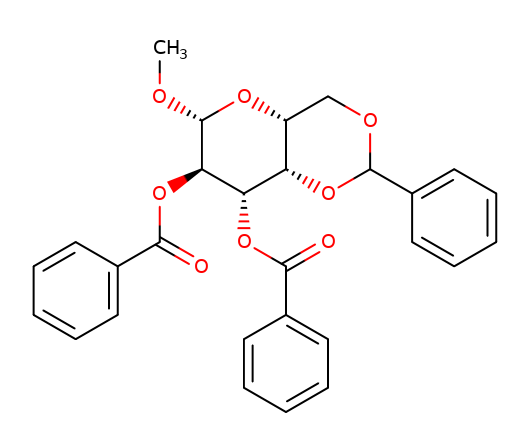 | InChI | InChI=1S/C28H26O8/c1-31-28-24(35-26(30)19-13-7-3-8-14-19)23(34-25(29)18-11-5-2-6-12-18)22-21(33-28)17-32-27(36-22)20-15-9-4-10-16-20/h2-16,21-24,27-28H,17H2,1H3/t21-,22+,23+,24-,27?,28-/m1/s1 |